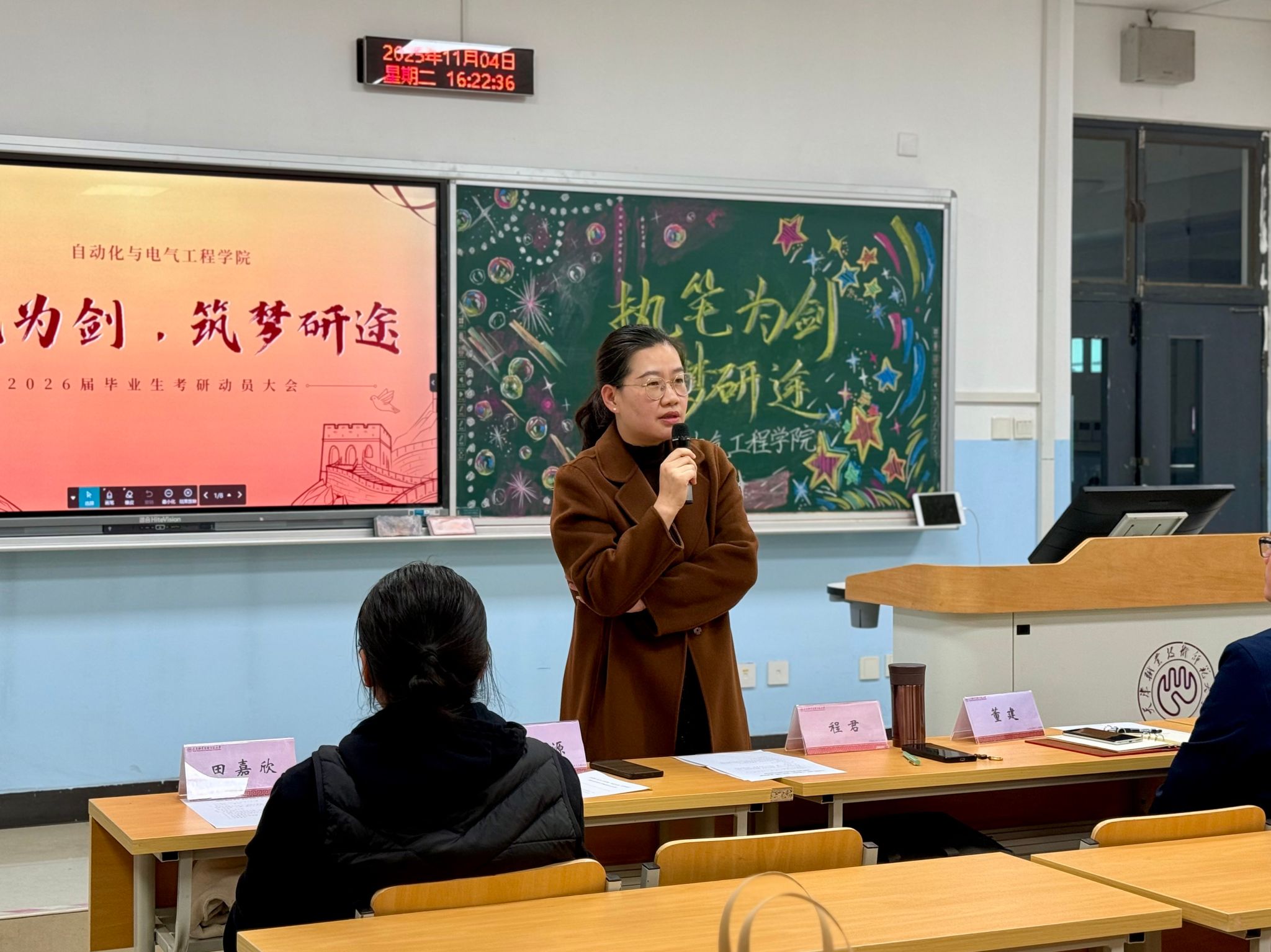 今日主动化取电气呼呼工程教院正在两教207讲堂启铺“援笔为剑,筑梦研途”2026届考研教死慰劳举动。院党委副布告程君,副院少董修代替教院指导班子到临现场对于考研教子停止慰劳,指导员田嘉欣、丁俏伍、李泓源、王珊,研讨死代替墨彦净及2026届考研结业死代替参与了原次举动。