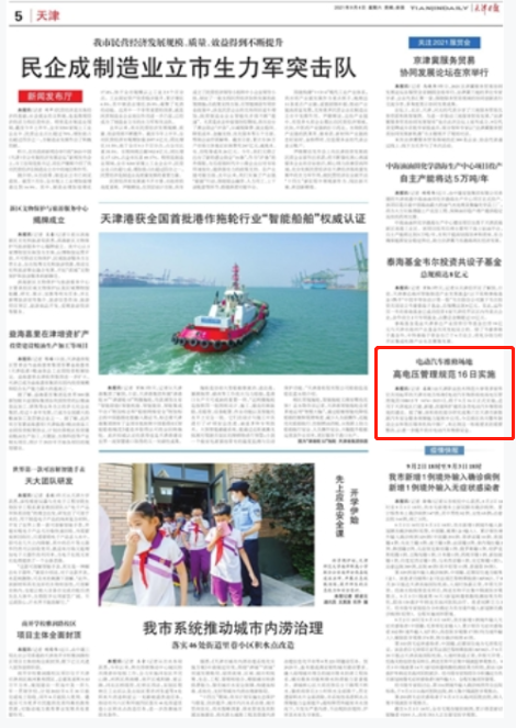 今日《天津日报》以“电动汽车修理园地下电压办理标准16日实行”为题报导了rb88体育草拟拟定的天津市中央规范《电动汽车培修园地下电压办理标准》揭晓实行。